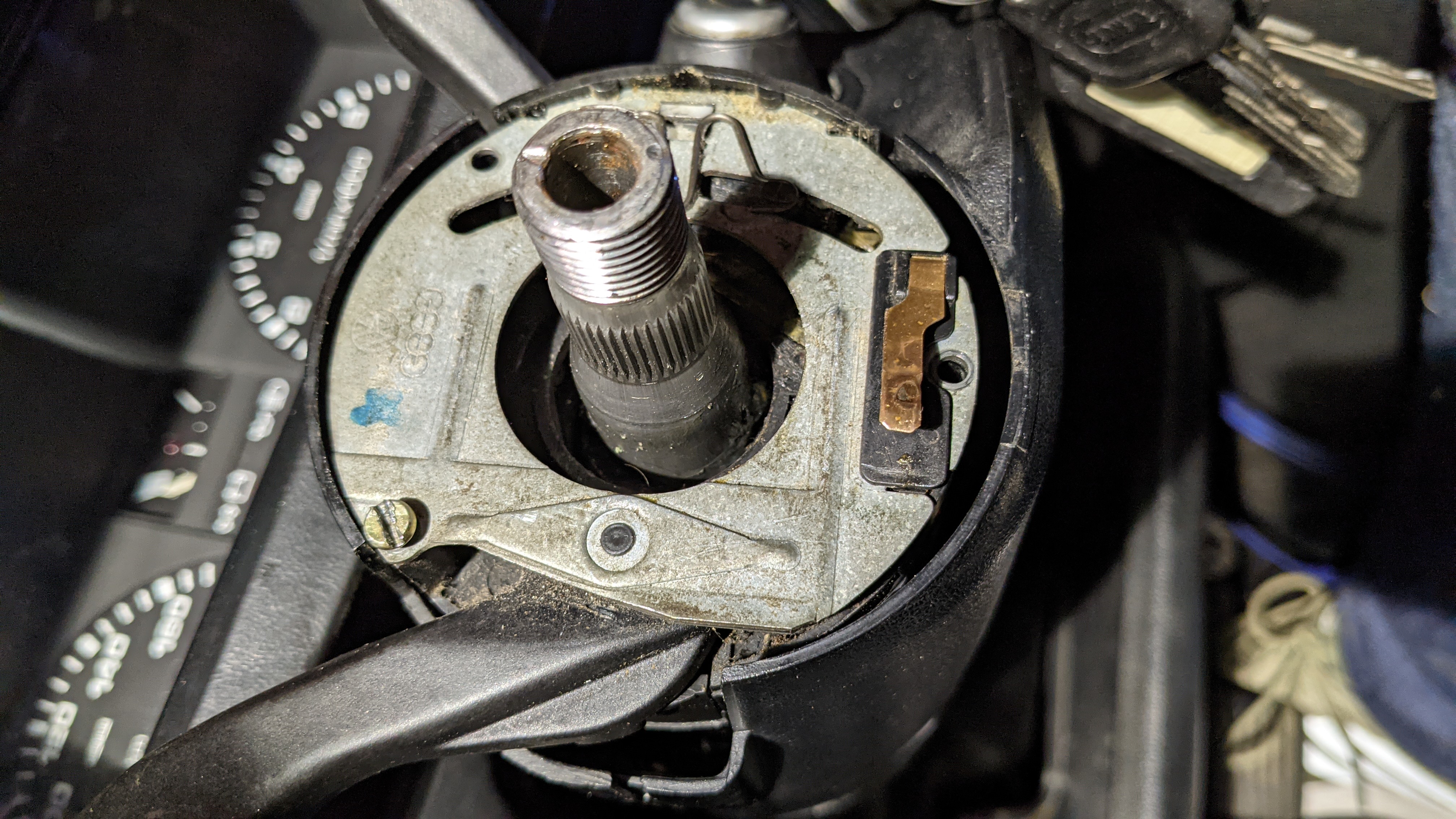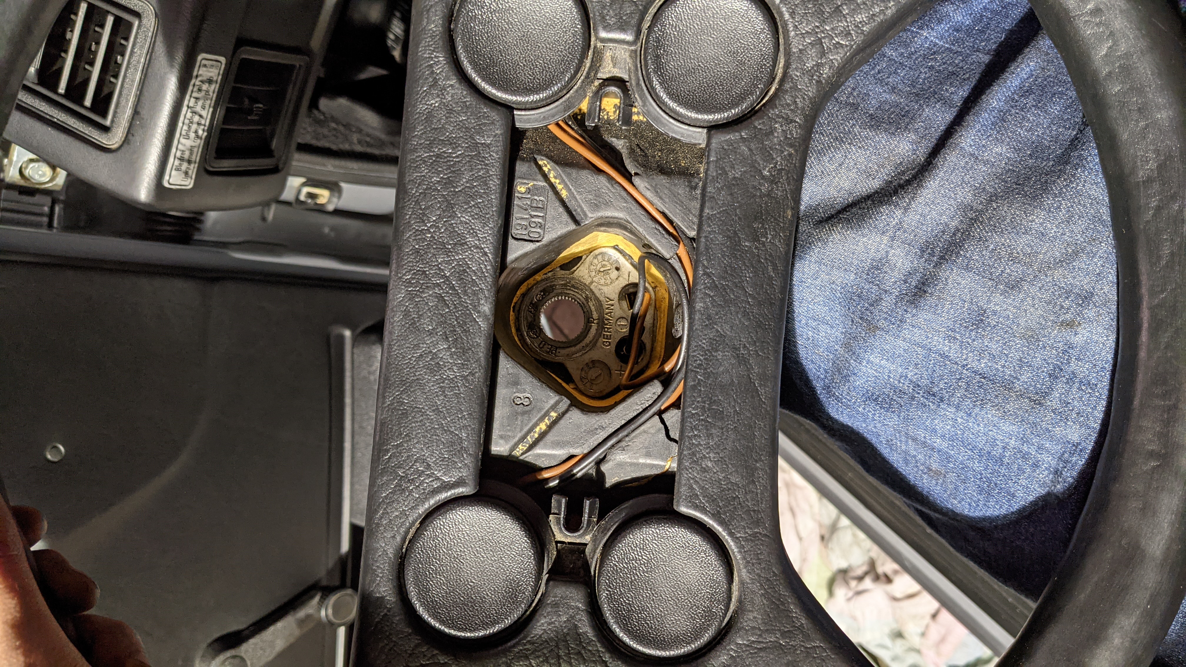 Blinker- und Wischerhebel wieder montiert, Lenkrad raufgesetzt, alles passt. Dann Zündung eingeschaltet und festgestellt, dass die Hupe dauerhaft geht. Fehler im Lenkrad kann ausgeschlossen werden.