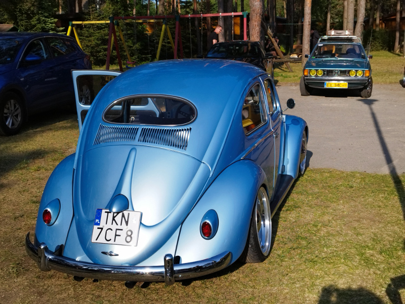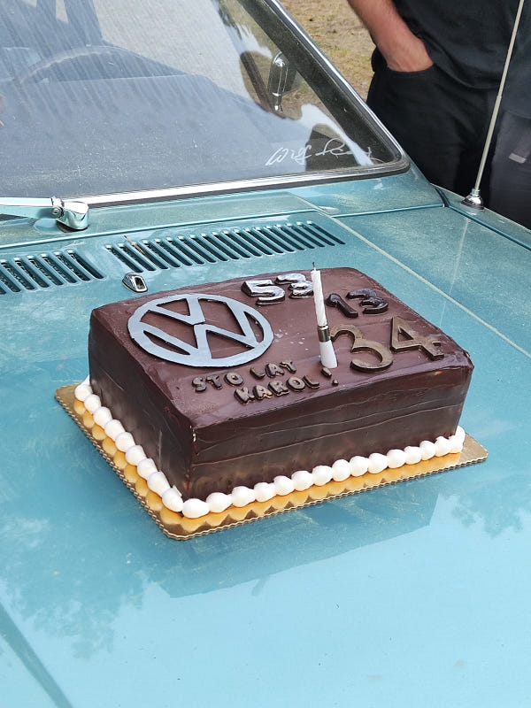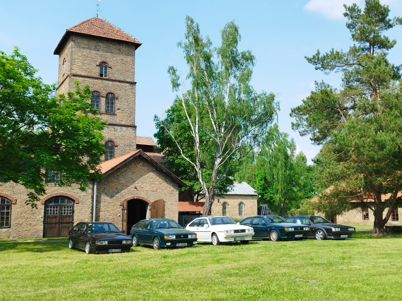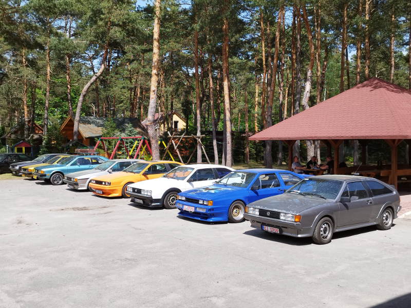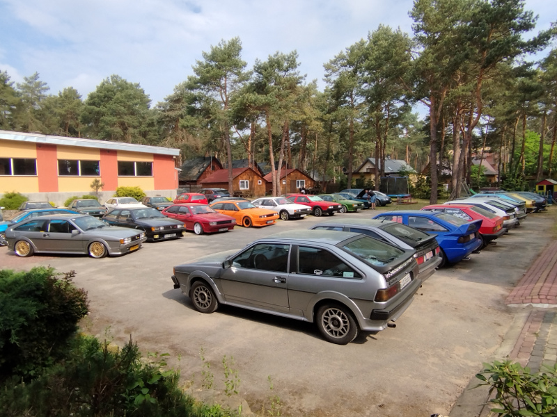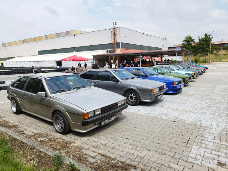 Es beginnt am Dienstag, Sonntag ist der Ausklang. Das reicht manchem Teilnehmer noch nicht: Zehn 53er sind bereits am Montag eingetroffen und glänzen zwischen festen Unterkünften, Wald und See in der Sonne, die das komplette Treffen begleitet hat. Daran hat auch der blitzartig vollautomatisch arbeitende Scirocco-Regenschirm - teils in Wagenfarbe - als Begrüßungsgeschenk nichts geändert; aber auch als Sonnenschirm ist er willkommen. Das T-Shirt zur Begrüßung weist auf das 13. Sciroccotreffen in Polen hin, was 2023 im Heiligkreuzgebirge stattfindet. So geht es im Sciroccokonvoi mit rund 30 Karmännern steigungs- und kurvenreich am Mittwoch zur Kartbahn, wo wir erfahren können, wie sich ein wirklich hartes Fahrwerk anfühlt. Auch einer der beiden Wachhunde, die dem Treffen die gebotene Sicherheit verliehen haben, traut sich ans Steuer. Obwohl in den in Summe 180 Euro Eintritte, knapp sechsstündige Kartbahnnutzung und sämtliche Übernachtungen in festen Häusern sowie das jeweils durch verschiedene Blechkuchensorten und landestypische heiße Suppen bereicherte Frühstück und Abendessen enthalten sind, servieren die Kartbahnmanager den Sciroccofans zum Mittag unentgeltlich ein kaltes Buffet, Getränke und Knabbereien.