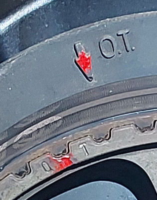 Ist es richtig, dass diese Markierung den dynamischen Zündzeitpunkt anzeigt. Wenn ich bei laufendem Motor (= bei 900 +/- 100 RPM und abgezogenem Unterdruckschlauch) abblitze, dann steht diese Markierung exakt in der Mitte der Öffnung.