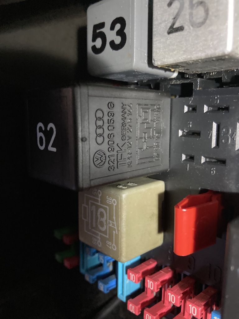 Habe beim lokalen VW Händler mal nachgefragt. Kraftstoffpumpenrelais 62 (321906059G) ist entfallen, Ersatz ist Relais 65 (321906059H), welches noch bei VW Classic Parts für 47,99€ + 7,50€ Versand zu haben ist, Newsletter Abo gibt 10% Rabattcode B-)